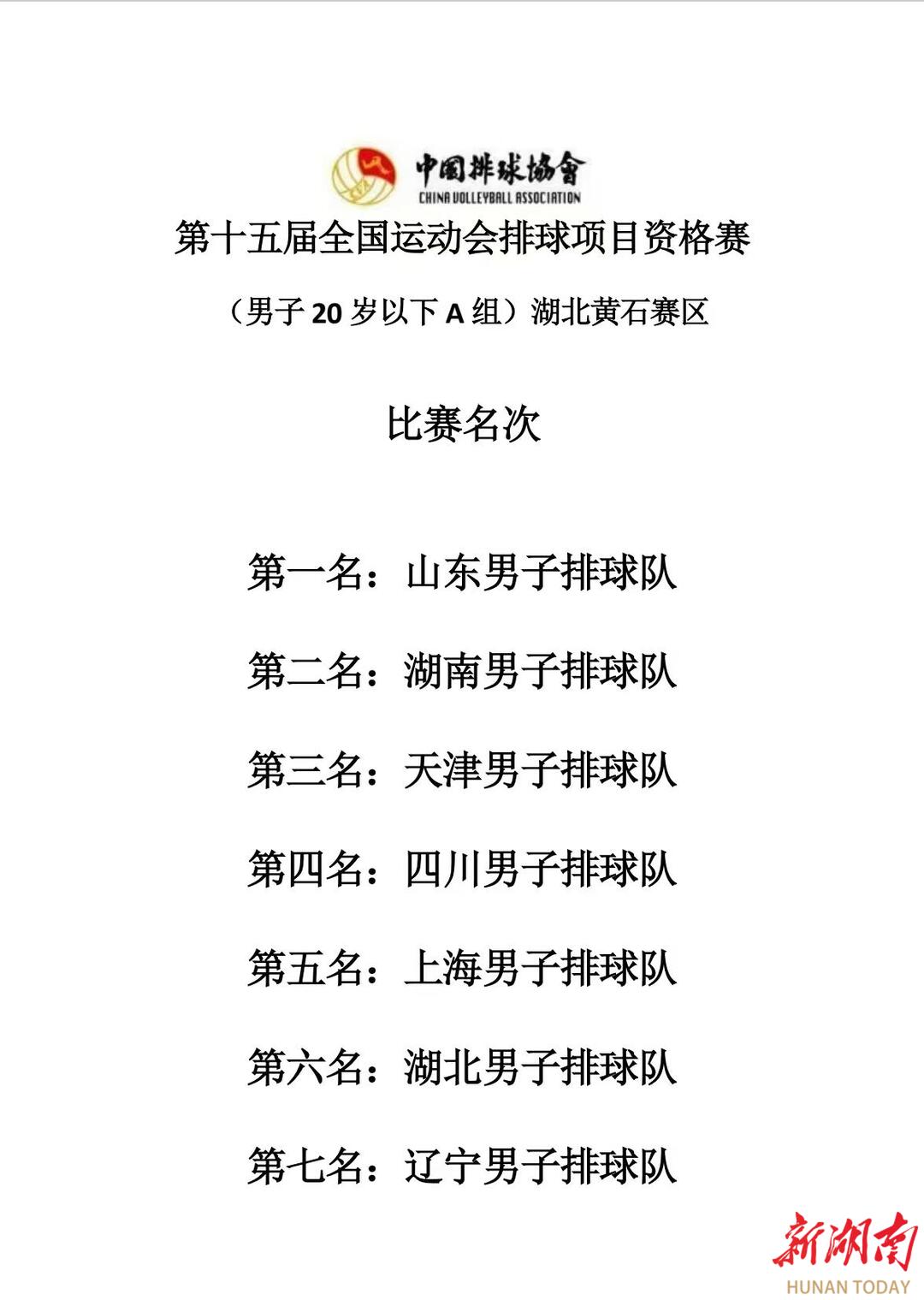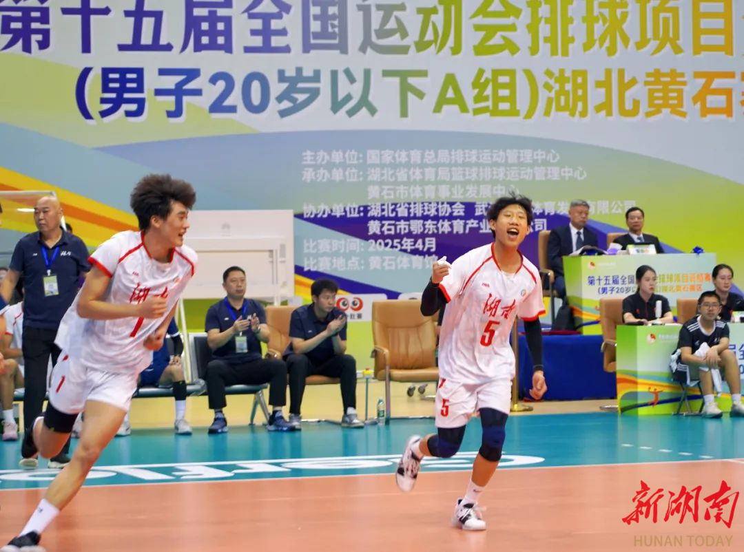 湖南日报·新湖南客户端4月26日讯(记者 蔡矜宜)4月25日下午,在第十五届全国运动会排球项目资格赛(男子20岁以下组)湖北黄石赛区的一场焦点大战中,身着白色球衣的湖南U20男排3比0战胜天津队,从而锁定赛区前五名,湖南青年男排历史首次闯入全运会决赛阶段!