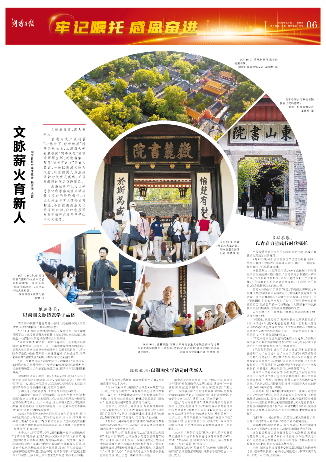 在湖南这片浸润着“心忧天下、经世致用”精神的热土上,从湖南大学岳麓书院“实事求是”匾额的熠熠生辉,到湖南第一师范“读无字之书”的育人箴言,一场以湖湘文脉为根脉、以立德树人为主线的新时代育人实践,正书写着新时代的奋进篇章。