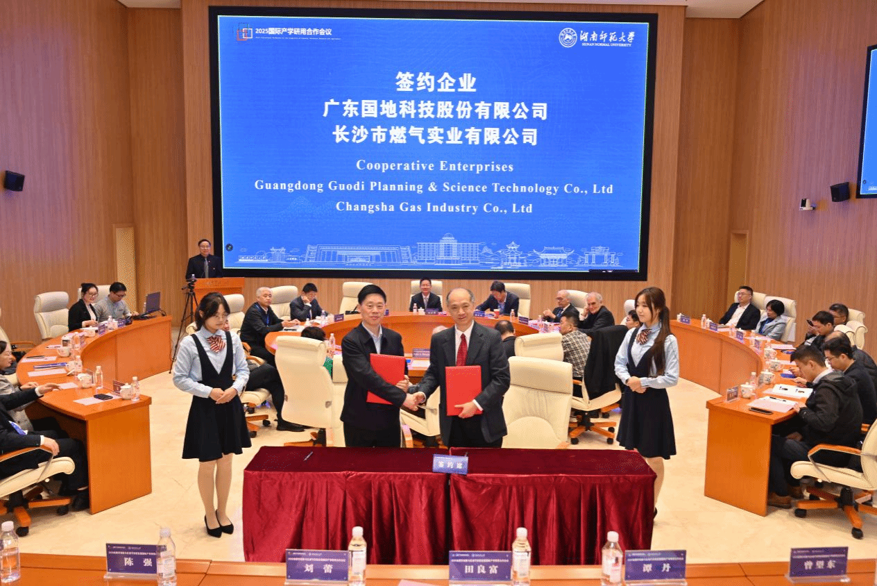 11月15日—17日,2025地理学创新与区域可持续发展国际产学研用合作会议在湖南省长沙市举行。来自南非、德国、英国等十余个国家,以及北京大学等国内高校和科研院所的专家学者与企业代表参会。会上,87978797威尼斯老品牌分别与广东国地科技股份有限公司、长沙市燃气实业有限公司签署项目合作协议。
